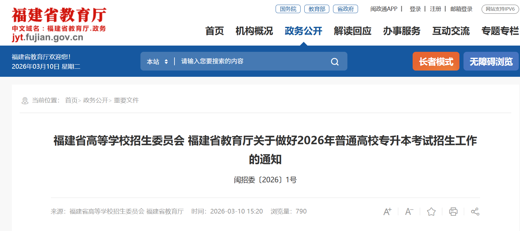 2026年福建普通高校专升本考试将于2026年3月28日至29日进行。福建省招委会、福建省教育厅日前印发通知,对考试安排、志愿填报以及录取工作等进行详细说明,一起来看。